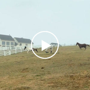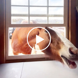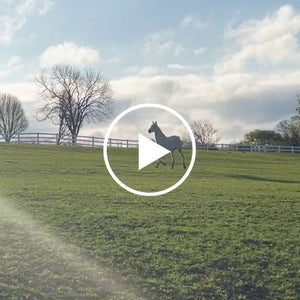 As a racehorse, Foster sustained a severe injury to his rear right leg which led to neglect and starvation. We rescued him from an auction and brought him home, where we helped him recover. He arrived at the same time as Daisy and another horse, but sadly, the other horse did not make it. Despite his difficult past, Foster has thrived and continues to amaze us with his abilities